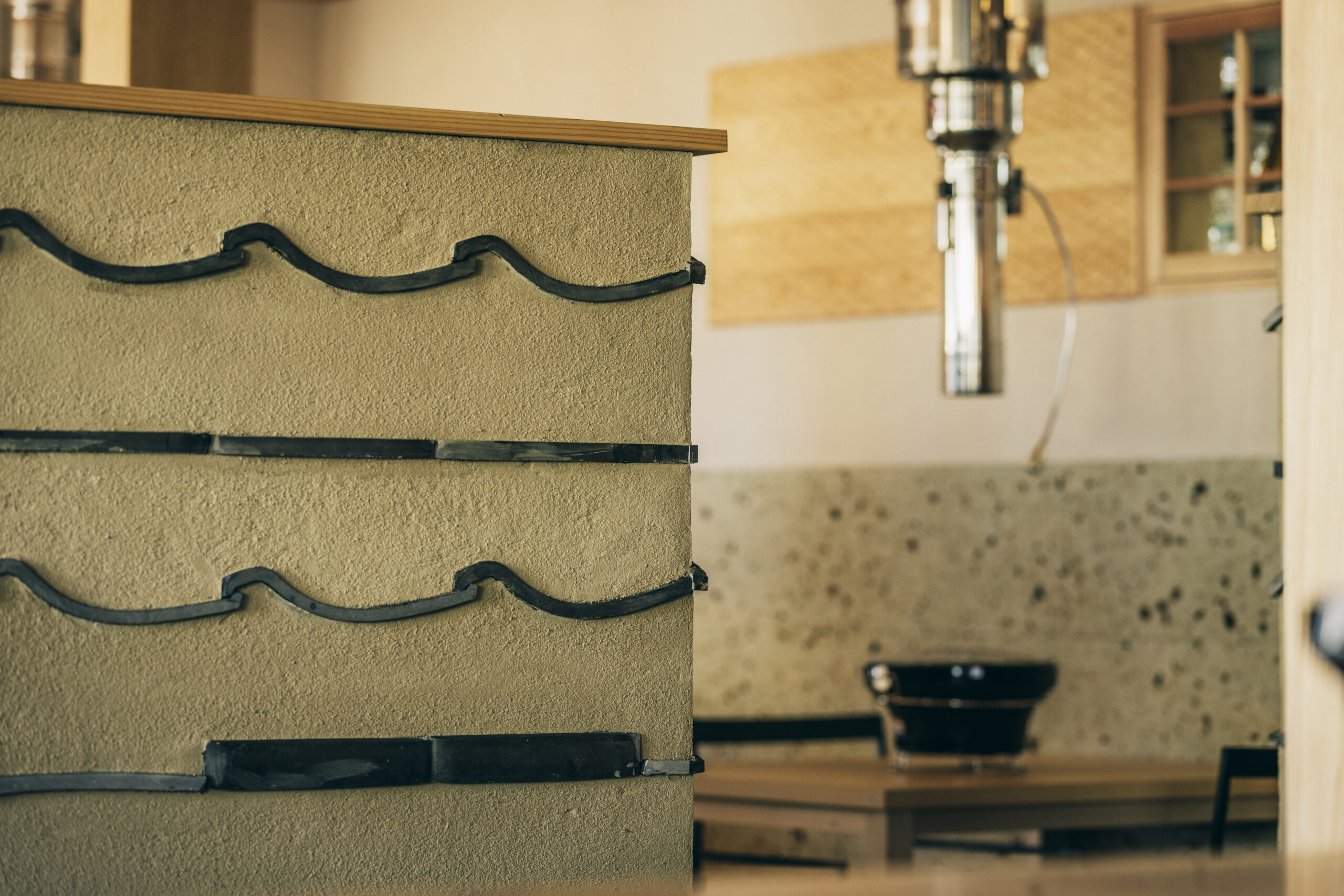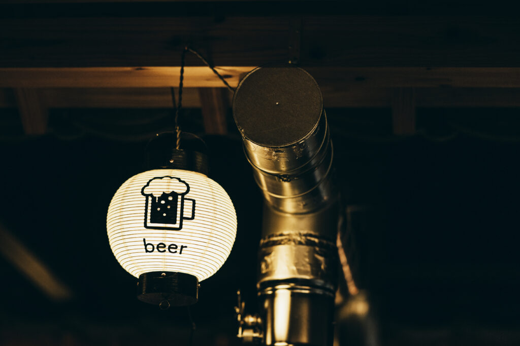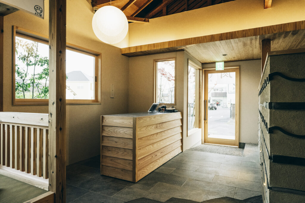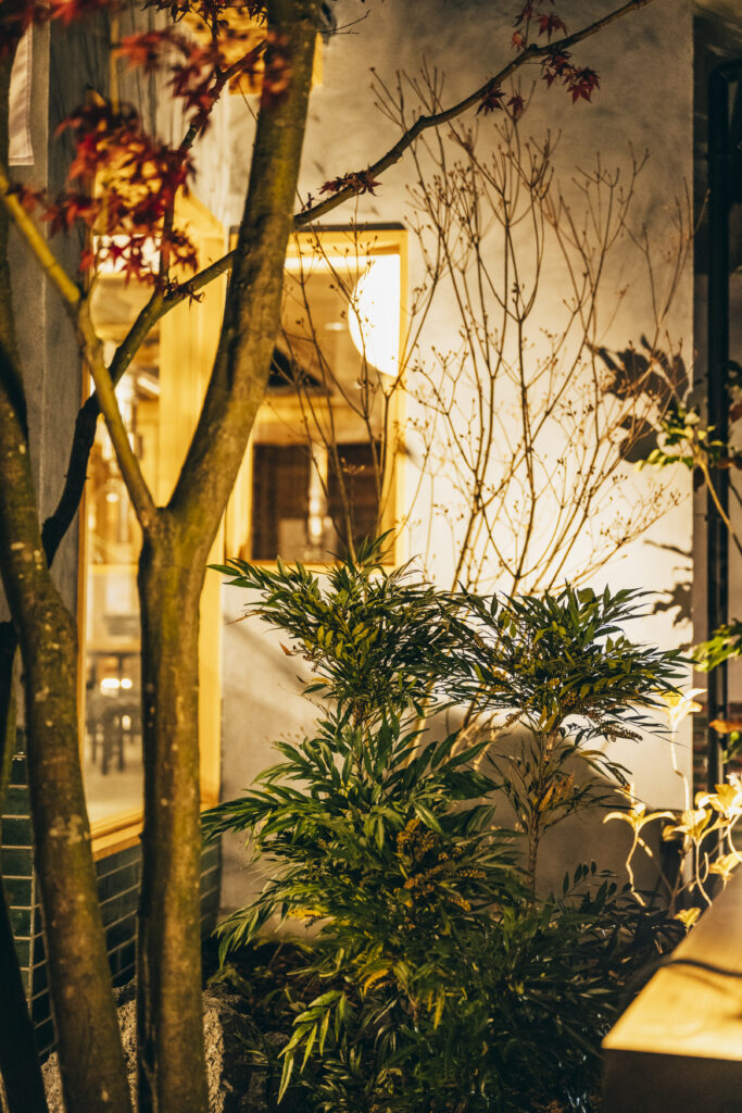 中心の吹き抜け空間には瓦で庇を製作し、提灯を設置して中庭の雰囲気を演出。