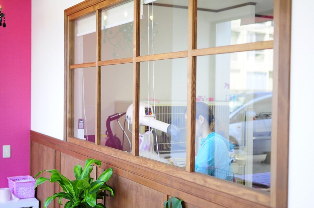 トリミングしている様子が見えるようにガラスの間仕切り。