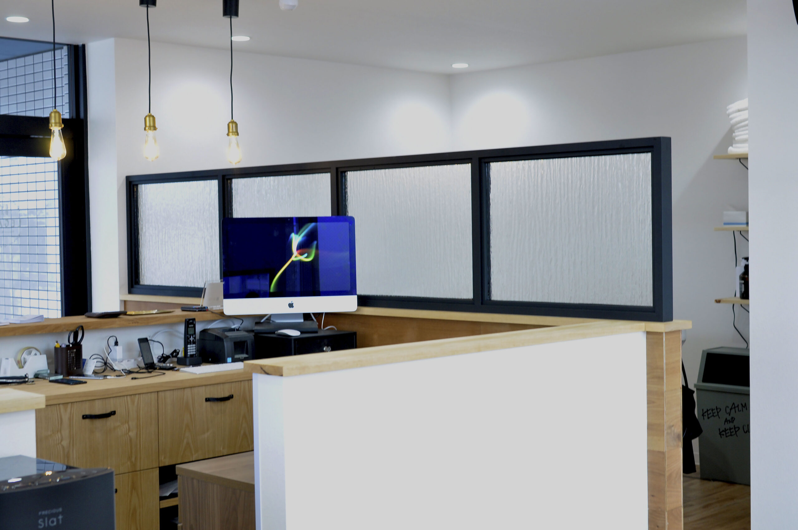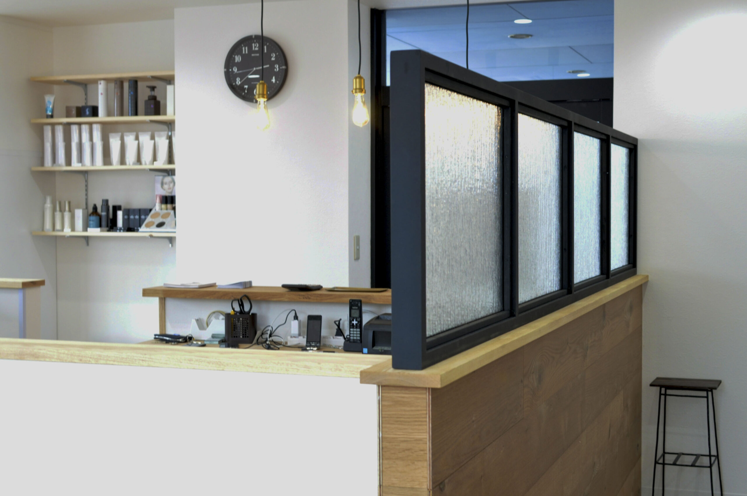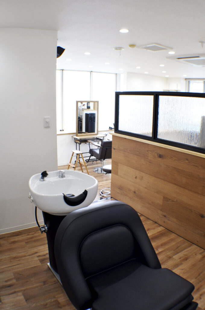 店内奥には小上がりのシャンプースペースを設け、無垢材とガラスのパーテションで視線が抜けないように。